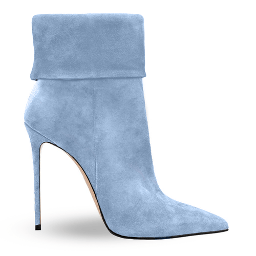 Spitz zulaufende Stiefelette aus echtem Wildleder mit Umschlag und 100 mm oder 120 mm Pfennigabsatz