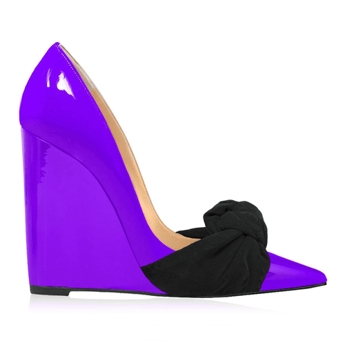 Spitz zulaufendes Dekolleté aus Lackleder mit Schleife aus echtem Wildleder, 100 mm Keilabsatz