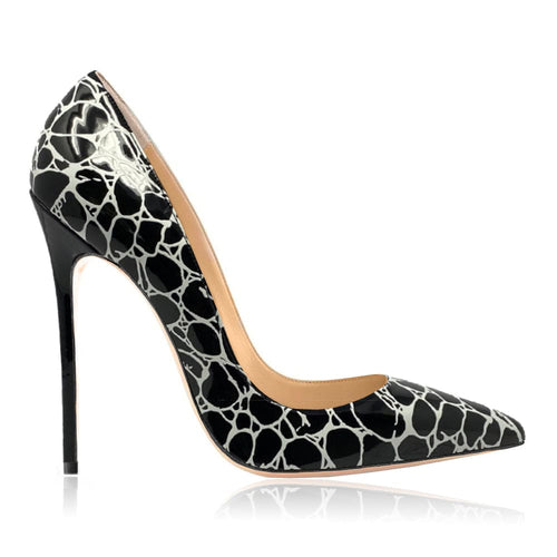Décolleté bout pointu en cuir verni imprimé et talon aiguille 100 mm ou 120 mm