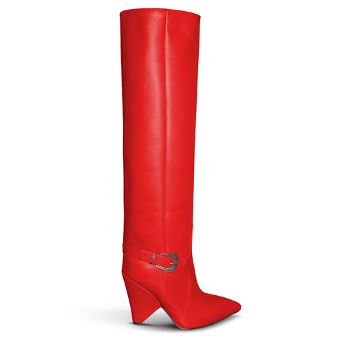 Stivale tubolare a punta sfilata in vera pelle con cinturino e fibbia, tacco medio a cono da 90mm