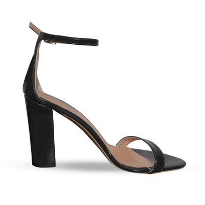 Sandalo a punta tonda con fascia in pelle verniciata con cinturino alla caviglia regolabile, tacco largo da 100mm