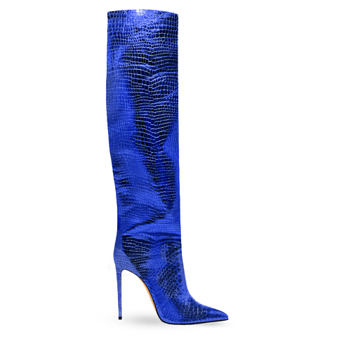 Pointed toe tubular boot in snake effect laminated leather with 100mm or 120mm stiletto heel