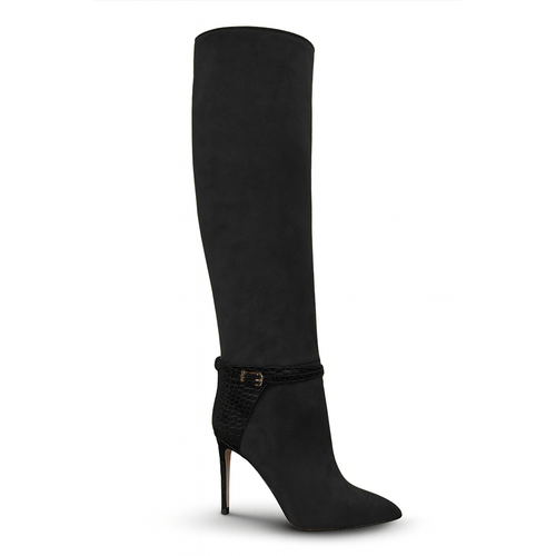 Tubular pointed toe suede boot with crocodile leather straps. Stiletto heel of 80mm, 100mm, or 120mm