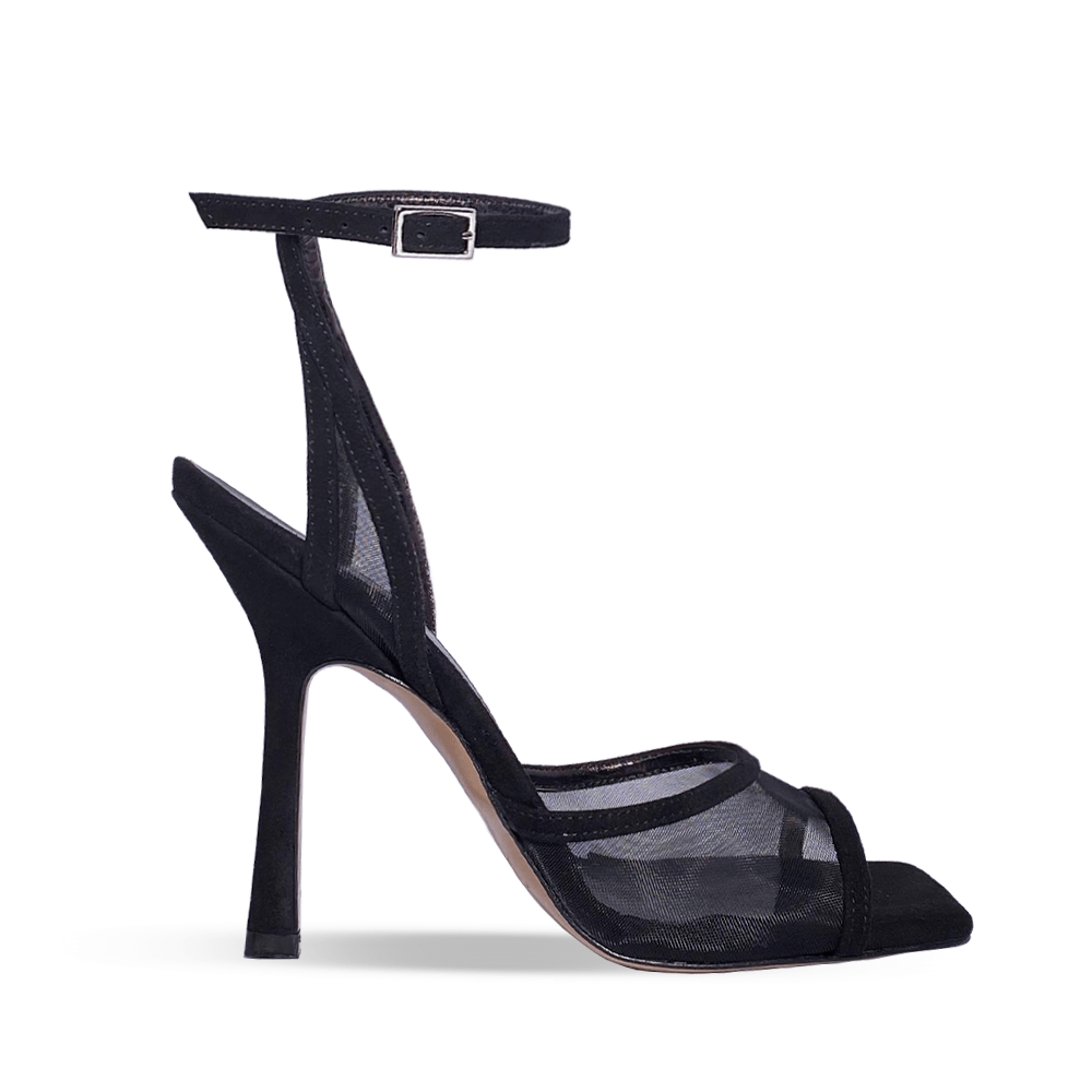 Square-toe peep-toe sandal in suede with semi-transparent mesh and ankle strap. 100mm hourglass heel